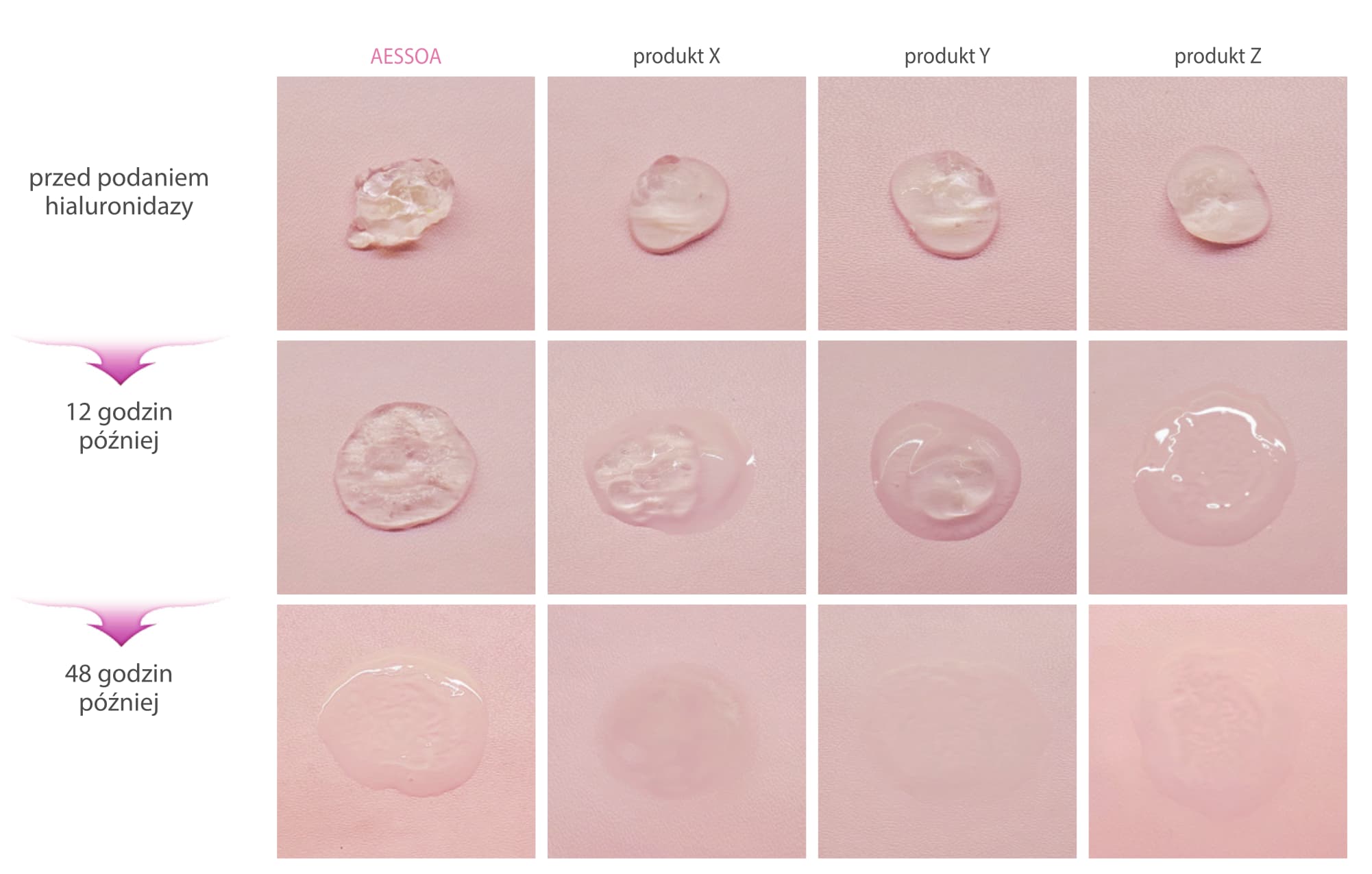 - Całkowita biodegradowalność po 48h od podania hialuronidazy