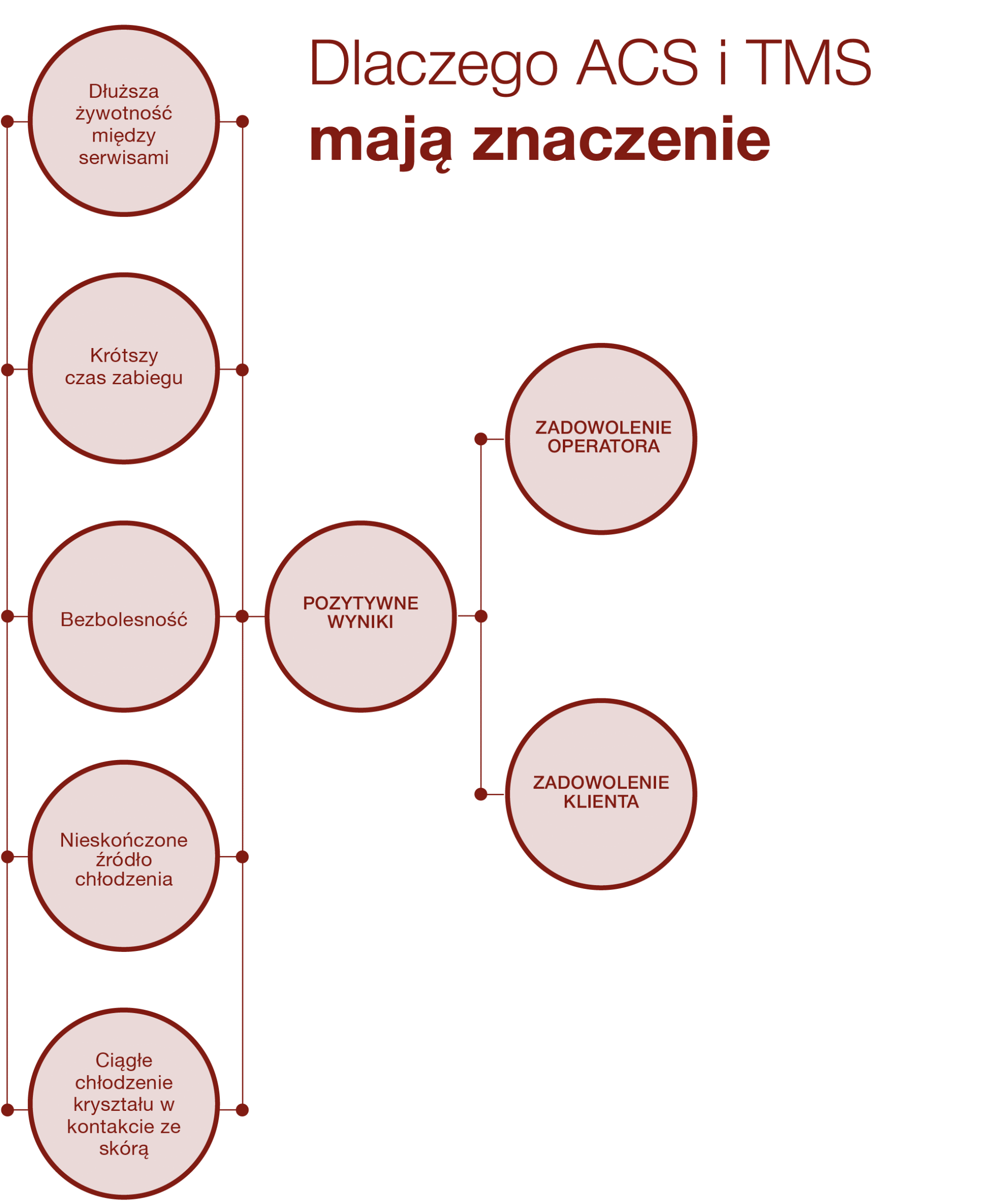 • Innowacyjny system chłodzenia: Dynamiczny system chłodzenia (ACS) utrzymuje stałą temperaturę podczas całego zabiegu, zapewniając komfort pacjenta i minimalizując ryzyko podrażnień.
