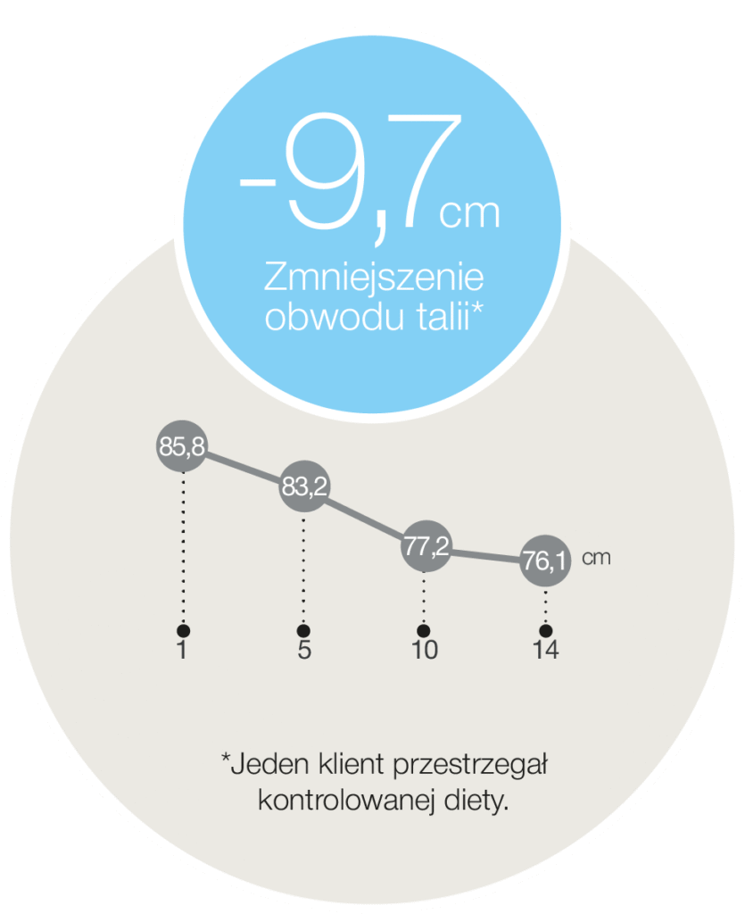 -9,7 cm – redukcja obwodu talii po 14 zabiegach*