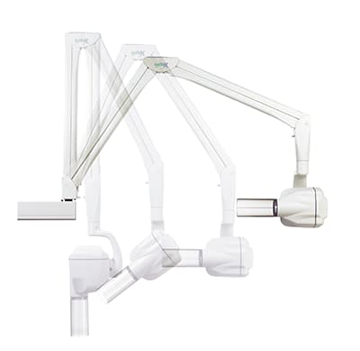 Ergonomiczna, obrotowa głowica z podwójną przesłoną eliminującą promieniowanie miękkie gwarantuje wygodę pracy w każdym ustawieniu. Długi tubus 30 cm (standard) ułatwia precyzyjne pozycjonowanie, a opcje krótkiego lub prostokątnego tubusa zwiększają wszechstronność. Ramię pantograficzne, lekkie i pokryte tworzywem ABS, dostępne w długościach 40/80/110 cm, zapewnia zasięg do 220 cm, idealnie dopasowując się do konfiguracji gabinetu – od ściennego montażu po wersje mobilne.