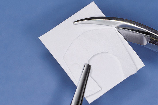 - Przytnij membranę do pożądanego kształtu za pomocą przygotowanego szablonu zachowując 3 mm margines w stosunku do ubytku.