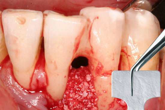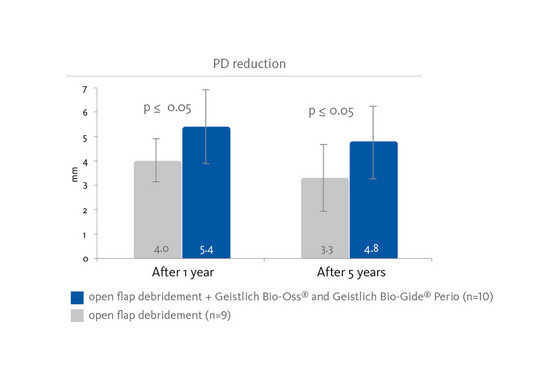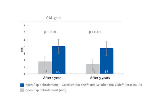 - Regenerowana regeneracja tkanek za pomocą Geistlich Bio-Gide® Perio i Geistlich Bio-Oss® Collagen prowadzi do utrzymania wyższego poziomu klinicznej przyczepności i zmniejszenia głębokości kieszeni w porównaniu z zabiegiem oczyszczania techniką otwartopłatową.