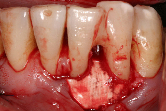 Przytwierdzanie: doskonała hydrofilność sprzyja przyleganiu Geistlich Bio-Gide® Perio do przeszczepu i otaczającej kości. Membranę można również zaszyć lub przytwierdzić pinami (dzięki uprzejmości prof. Christgau, Dusseldorf, Niemcy).