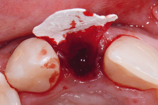 • Należy umieścić membranę bez uprzedniego zwilżenia w zębodole poekstrakcyjnym.