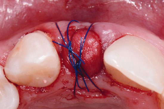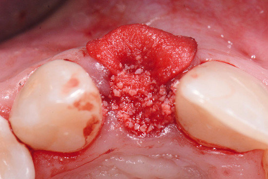 • Ubytek wypełniony jest materiałem kościozastępczym, takim jak autologiczna kość, bądź jej substytut (na przykład Geistlich Bio-Oss®/Geistlich Bio-Oss® Collagen).