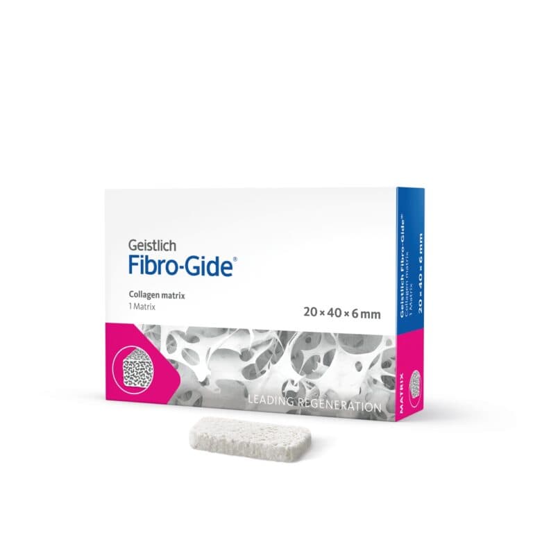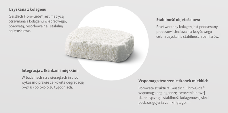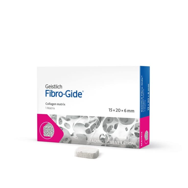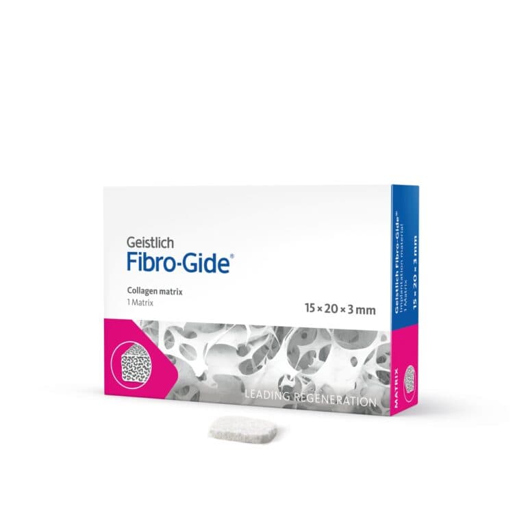Geistlich Fibro-Gide® jest matrycą na bazie kolagenu wieprzowego, porowatą, resorbowalną i objętościowo stabilną, zaprojektowaną z myślą o regeneracji tkanek miękkich. Matryca Geistlich Fibro-Gide® została stworzona jako alternatywa dla przeszczepów łącznotkankowych uważanych za złoty standard w zabiegach regeneracji tkanek miękkich. Ta kolagenowa matryca przeznaczona jest do regeneracji tkanek miękkich w obrębie wyrostka zębodołowego wokół naturalnych zębów oraz implantów. Należy ją stosować w gojeniu zamkniętym. Pełni wówczas funkcję rusztowania, które umożliwia zwiększenie grubości tkanek miękkich tam, gdzie jest to klinicznie pożądane.
