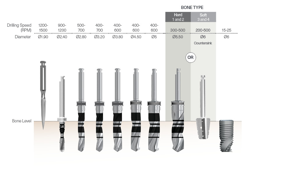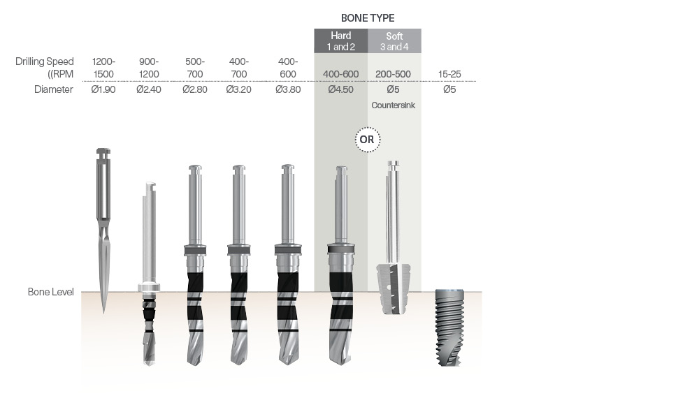 Przy twardej kości należy zadbać o usunięcie, powstałych podczas wiercenia, wiórów kostnych poprzez kilkukrotne osiągnięcie pełnej głębokości nawiertu ruchem pulsacyjnym. Sekwencja wykonywania nawiertów jest identyczna dla implantów C1 i SEVEN. Sekwencja wykonywania nawiertów jest opisana dla implantu C1 13 mm.