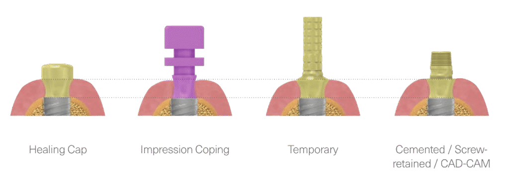 Łączniki w kolorze złotym minimalizują widoczność przez dziąsło, co pozwala uzyskać lepsze efekty estetyczne w przypadku cienkiej morfologii tkanek miękkich.