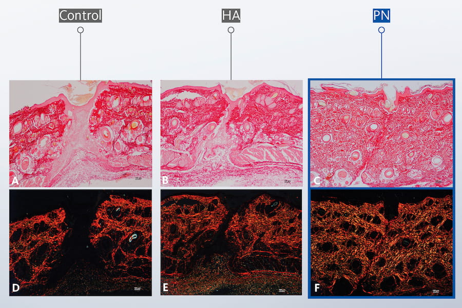 Mikrofotografia gojących się ran w grupie kontrolnej (A), z kwasem hialuronowym – HA (B), z polinukleotydami – PN (C), po barwieniu kolagenu Sirius Red przy użyciu światła przechodzącego (A, B, C) lub spolaryzowanego (D, E, F).