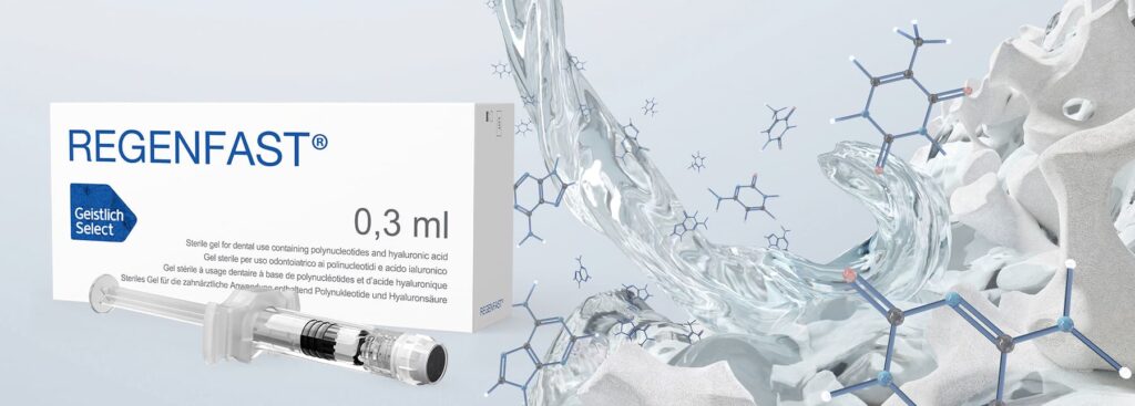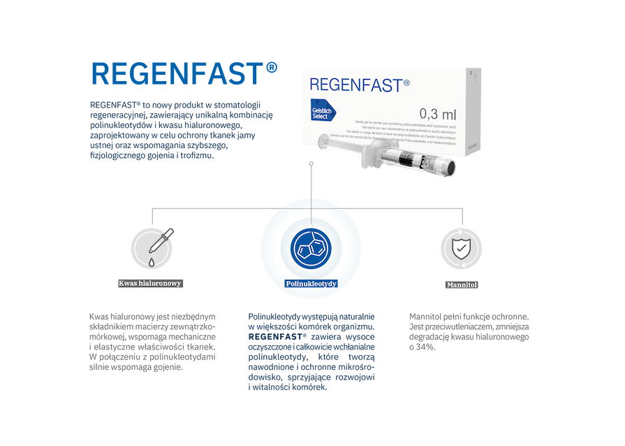 W REGENFAST® po raz pierwszy w produkcie stomatologicznym połączono polinukleotydy, kwas hialuronowy i mannitol, wykorzystując w ten sposób biologiczny potencjał wszystkich składników. Pobudzane są różne komórki tkankowe istotne dla procesów regeneracji tkanek twardych i miękkich.