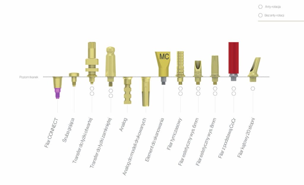 Filary CONNECT są jednoczęściowe – nie posiadają oddzielnej śruby protetycznej. 40-stopniowy kąt wejścia filaru umożliwia płynne osadzenie zarówno koron, jak i mostów. Główną zaletą wewnętrznego połączenia jest najwyższa precyzja oraz doskonałe dopasowanie z dostępnymi elementami.